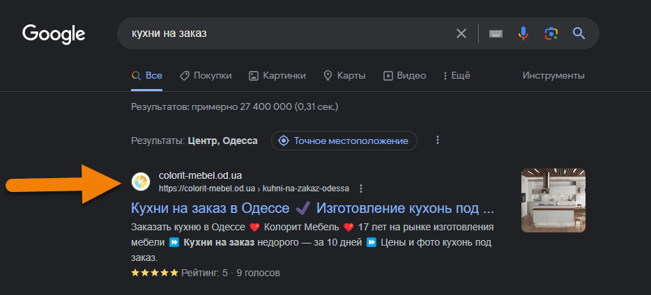 Задание заказчика: вывести запрос “кухни на заказ” в ТОП-1 поисковой выдачи Google в условиях большой конкуренции по этому направлению.